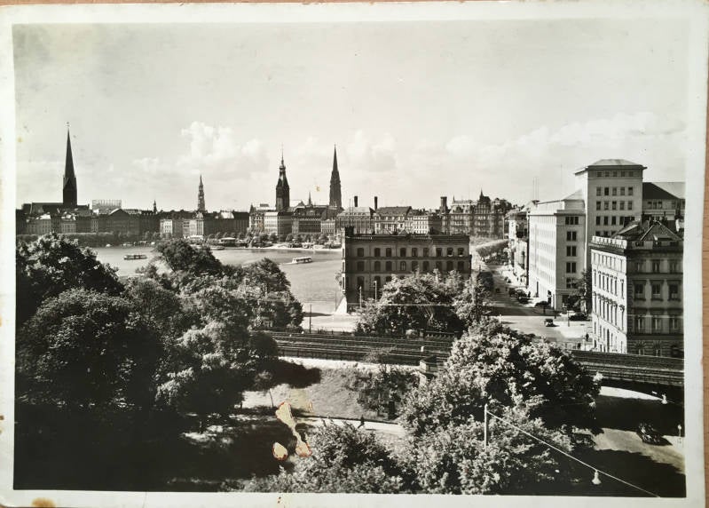 Deze opname van de binnenstad van Hamburg is gemaakt door Hans Hartz, Vermoedelijk omstreeks 1935-1943. De kaart is naar het schijnt tijdens de tweede wereld oorlog verstuurd.